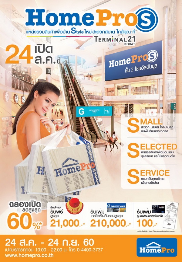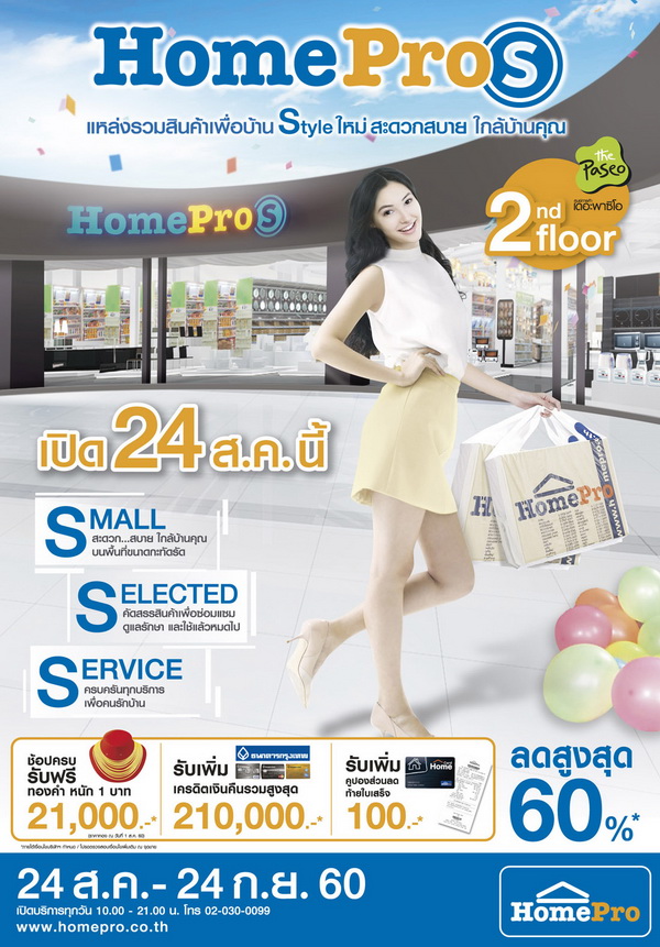 "โฮมโปร" ฉลองเปิด 2 สาขาใหม่ "HomePro S" @ พาซิโอลาดกระบัง และเทอร์มินอล 21 โคราช แหล่งรวบรวมสินค้าเพื่อบ้าน สไตล์ใหม่ ครบครันไปด้วยคุณภาพทั้งสินค้า และบริการ เพื่อคนรักบ้าน มาพร้อมกับโปรโมชั่นพิเศษสุด เพียง 3 วันเท่านั้น 25-27 สิงหาคม แลกซื้อสินค้าราคาพิเศษ จำนวนจำกัด พร้อมสินค้าลดสูงสุดกว่า 60% ตั้งแต่วันที่ 24 ส.ค. – 24 ก.ย. 60