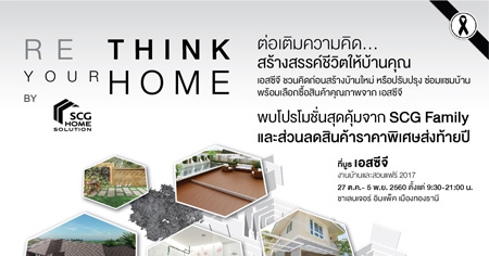 "เอสซีจี" ผู้นำนวัตกรรมสินค้าวัสดุก่อสร้างครบวงจรชวนเจ้าของบ้านที่กำลังคิดจะสร้างบ้านใหม่ หรือปรับปรุง ซ่อมแซมบ้าน มาร่วมต่อเติมความคิดและสร้างสรรค์ชีวิตให้บ้านคุณที่บูธเอสซีจี งานบ้านและสวนแฟร์ 2017 ซึ่งจัดขึ้นภายใต้คอนเซ็ปต์ "RE THINK YOUR HOME BY SCG HOMESOLUTION" พบกับนวัตกรรมการให้บริการเรื่องบ้านแบบครบวงจร พร้อมมีบริการให้คำปรึกษาโดยทีมผู้เชี่ยวชาญเอสซีจีกับ3บริการที่จะตอบเรื่องบ้านได้อย่างตรงจุด ได้แก่ RE THINKการบริการให้คำปรึกษา วางแผน ก่อนการตัดสินใจสร้างบ้านRE DESIGNการบริการออกแบบบ้านแบบ 3 มิติ พร้อมประมาณราคา และ RENOVATE การบริการปรับปรุงและซ่อมแซมบ้านนอกจากนี้ยังมีโปรโมชั่นสุดคุ้มส่งท้ายปีจาก SCG Family ยกทัพสินค้าจากเอสซีจีมาให้ช้อปมากมายและส่วนลดสุขภัณฑ์ก๊อกน้ำ ลดสูงสุด 60%