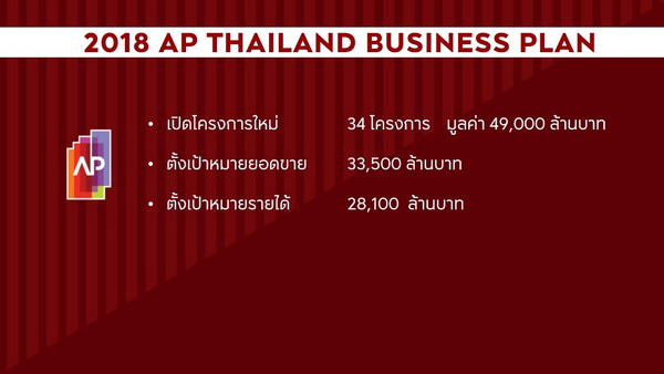 บริษัท เอพี (ไทยแลนด์) จำกัด (มหาชน) ผู้นำด้านการพัฒนาโครงการอสังหาริมทรัพย์ ของประเทศไทย แสดงวิสัยทัศน์ “เชื่อมั่นตลาดอสังหาริมทรัพย์ไทยยังคงเติบโตอย่างต่อเนื่อง” โดยเอพีพร้อมเดินหน้ารับเทรนด์ตลาด ตั้งเป้ายอดขายไว้ที่ 33,500 ล้านบาท และตั้งเป้ารายได้รวมปี 2561 ไว้ที่ 28,100 ล้านบาท ด้วยการรุกตลาดเปิดตัวโครงการใหม่ 34 โครงการ มูลค่ารวมกว่า 49,000 ล้านบาท แบ่งเป็นคอนโดมิเนียม 4 โครงการ มูลค่า 19,000 ล้านบาท และโครงการแนวราบ 30 โครงการ มูลค่า 30,000 ล้านบาท ผ่าน 5 กลยุทธ์สู่ความสำเร็จ 1) สานต่อความสำเร็จกับกลุ่มมิตซูบิชิ เอสเตท 2) เปิดตัวสินค้าระดับ Super Luxury 3) รุกตลาดสินค้าแนวราบ สร้างความต่างด้วยการออกแบบสินค้าที่ตอบความต้องการเฉพาะกลุ่ม 4) ขยายพอร์ตตลาดต่างประเทศ 5) พัฒนานวัตกรรมดิจิตอลเพื่อคุณภาพชีวิตที่ดี หลังปีที่ผ่านมา (2560) กวาดยอดขายรวมได้กว่า 42,900 ล้านบาท เกินจากเป้าหมายยอดขายเดิมที่ตั้งไว้ในปี 2560 คือ 26,000 ล้านบาท หรือโตขึ้นถึง 92% หากเทียบกับยอดขายปี 2559 ที่ทำได้ 22,365 ล้านบาท