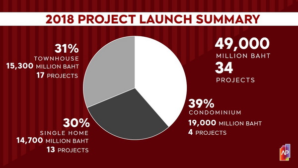 ทั้งนี้ สรุปสำหรับแผนการพัฒนาโครงการในปี 2561 นี้บริษัทฯ เตรียมเปิดตัวโครงการใหม่จำนวนทั้งสิ้น 34 โครงการ มูลค่ารวมประมาณ 49,000 ล้านบาท โดยแบ่งเป็นคอนโดมิเนียม 4 โครงการ มูลค่า 19,000 ล้านบาท และโครงการแนวราบ 30 โครงการ มูลค่า 30,000 ล้านบาท โดยตั้งเป้าหมายยอดขายไว้ที่ 33,500 ล้านบาท และตั้งเป้าหมายรายได้รวมปี 2561 ไว้ที่ 28,100 ล้านบาท โดยในครึ่งปีแรกบริษัทฯ เตรียมเปิดตัวโครงการใหม่ 12 โครงการ มูลค่า 14,900 ล้านบาท โดยเป็นโครงการแนวราบ 10 โครงการ ประกอบด้วยบ้านเดี่ยว 2 โครงการ และทาวน์โฮม 8 โครงการ มูลค่ารวมประมาณ 9,900 ล้านบาท และ 2 คอนโดมิเนียมใหม่ คือ Aspire สาทร-ราชพฤกษ์ คอนโดมิเนียม สูง 32 ชั้น จำนวน 1,049 ยูนิต มูลค่า 3,000 ล้านบาท โดดเด่นด้วย 1 ก้าวจากสถานีบางหว้า สถานีเชื่อมต่อขนาดใหญ่ระหว่าง BTS และ MRT ราคาเริ่มต้น 1.89 ล้านบาท พร้อมเปิดขายในวันที่ 24-25 กุมภาพันธ์นี้ และ LIFE สุขุมวิท 62 คอนโดมิเนียมร่วมทุน สูง 24 ชั้น จำนวน 438 ยูนิต มูลค่าโครงการ 2,000 ล้านบาท เพียง 200 เมตรจาก BTS บางจาก ซึ่งเตรียมเปิดขายผ่านระบบออนไลน์ บุคกิ้งในวันที่ 27 มีนาคมนี้