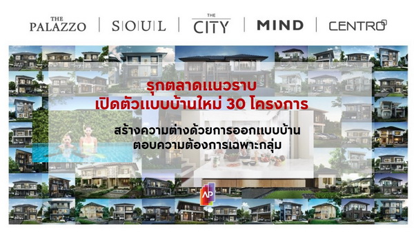 3. รุกตลาดสินค้าแนวราบ สร้างความต่างด้วยการออกแบบสินค้าที่ตอบความต้องการเฉพาะกลุ่ม (MASS CUSTOMIZED DESIGN) ในปีนี้ทีม AP Design Lab ไม่หยุดนิ่งที่จะสร้างความแตกต่าง ทั้งด้านการดีไซน์ และฟังก์ชั่นการใช้งานภายในตัวบ้าน เพื่อตอบความต้องการที่เฉพาะเจาะจงมากยิ่งขึ้น ซึ่งปัจจุบันเอพีได้พัฒนาแบบบ้านมากกว่า 70 แบบ กระจายอยู่ตามโครงการบ้านเดี่ยวและทาวน์โฮมในทำเลต่างๆ และในปี 2561 นี้เอพีพร้อมเปิดตัวแบบบ้านใหม่อีกจำนวนมาก ผ่านแผนการเปิดตัวโครงการแนวราบใหม่ จำนวน 30 โครงการ มูลค่ารวมประมาณ 30,000 ล้านบาท โดยเป็นทาวน์โฮม 17 โครงการ มูลค่า 15,300 ล้านบาท และบ้านเดี่ยว 13 โครงการ มูลค่า 14,700 ล้านบาท โดยมีเป้าหมายสำคัญคือ บ้านเดี่ยวและทาวน์โฮมเครือเอพี ต้องเป็นตัวเลือกที่ดีที่สุดสำหรับครอบครัวคนเมือง (THE ULTIMATE CHOICE FOR URBAN FAMILY)