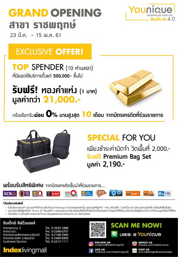 ฮอตฮิตติดใจคนรักบิวท์อินไปแล้ว!! สำหรับ “ยูนีค” (YOUNIQUE) เทคโนโลยีบิวท์อินอัจฉริยะ 4.0 ที่โดดเด่นแตกต่าง ฉีกทุกปรากฏการณ์บิวท์อิน เพราะสามารถออกแบบและดีไซน์ให้ตรงกับความต้องการของลูกค้าได้ 100% ที่สำคัญ ราคาถูกใจเพราะกำหนดงบได้เอง ซึ่ง อินเด็กซ์ ลิฟวิ่งมอลล์ (Index Living Mall) ผู้เชี่ยวชาญด้านเฟอร์นิเจอร์และของตกแต่งบ้านอันดับ 1 ในไทย ในฐานะผู้คิดค้นและพัฒนา ได้เปิดฉากรุกตลาดบิวท์อินไปเมื่อปีก่อนกับสาขาแรก ที่อินเด็กซ์ ลิฟวิ่งมอลล์ พระราม 2 โดยได้รับกระแสตอบรับล้นหลาม ก่อนสั่งลุยเปิดรวดอีก 2 สาขาส่งท้ายปี ที่อินเด็กซ์ ลิฟวิ่งมอลล์ สาขาบางนา และสาขาเกษตร-นวมินทร์ รวมเป็น 3 สาขา และล่าสุด อินเด็กซ์ ลิฟวิ่งมอลล์ จัดหนักจัดเต็มกับการเปิด “ยูนีค” (YOUNIQUE) แห่งที่ 4 ที่อินเด็กซ์ ลิฟวิ่งมอลล์ สาขาราชพฤกษ์ พร้อมแจกทองฉลองสาขาใหม่ พร้อมอัดโปรโมชั่นพิเศษมากมาย