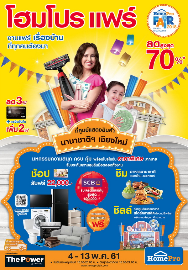 โฮมโปรขึ้นเหนือ จัดงาน โฮมโปร แฟร์ เชียงใหม่ งานแฟร์เรื่องบ้านที่ทุกคนต้องมา ช้อป ชิม ชิลล์ 10 วันเท่านั้น โปรโมชั่น ราคาพิเศษ มากมาย รับประกันความสุขล้นมือตลอดทั้งงาน ช้อปสินค้าเรื่องบ้านลดสูงสุด 70%ช้อปครบรับฟรี บัตรของขวัญโฮมโปรมูลค่า 22,000 บาทรับเครดิตเงินคืนสูงสุด 100,000 บาท จากบัตรเครดิตไทยพาณิชย์ บัตรเครดิตโฮมโปร วีซ่า แพลทินัม ลด 3% บวกเครดิตเงินคืนเพิ่ม 2%