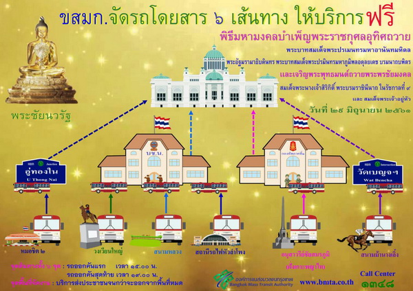 นายประยูร ช่วยแก้ว รองผู้อำนวยการ ฝ่ายการเดินรถองค์การ รักษาการในตำแหน่งผู้อำนวยการ องค์การขนส่งมวลชนกรุงเทพ (ขสมก.) เปิดเผยว่า ด้วยสมเด็จพระเจ้าอยู่หัวมหาวชิราลงกรณ บดินทรเทพยวรางกูร ทรงพระกรุณาโปรดเกล้าฯ ให้จัดพิธีมหามงคล บำเพ็ญพระราชกุศลอุทิศถวายพระบาทสมเด็จพระปรเมนทรมหาอานันทมหิดล พระอัฐมรามาธิบดินทร , พระบาทสมเด็จพระปรมินทรมหาภูมิพลอดุลยเดช บรมนาถบพิตร และเจริญพระพุทธมนต์ ถวายพระพรชัยมงคล สมเด็จพระนางเจ้าสิริกิติ์ พระบรมราชินีนาถ ในรัชกาลที่ 9 และสมเด็จพระเจ้าอยู่หัว ในวันศุกร์ที่ 29 มิ.ย. 2561 เวลา 18.00 น. ณ พระลานพระราชวังดุสิต ขสมก. จึงจัดเดินรถโดยสารให้บริการฟรี จำนวน 6 เส้นทาง เพื่ออำนวยความสะดวกให้กับประชาชนที่จะเดินทางไปร่วมสวดมนต์ในพิธีดังกล่าว โดยมีรายละเอียด ดังนี้