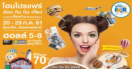 ห้ามพลาด ! 20 29 กรกฎาคม นี้ โฮมโปร จัดงาน "โฮมโปรแฟร์2018 ช้อป กิน บิน เที่ยว งานแฟร์เรื่องบ้านที่ทุกคนต้องมาช้อปสินค้าเรื่องบ้าน ยกขบวนมาลดกระหน่ำกว่า 70%กิน อิ่มอร่อยกับร้านดัง ต้นตำรับกว่า 150 ร้านค้าทั่วกรุง บินฟรีทั้งใน และต่างประเทศ เที่ยว กับแพ็คเก็จราคาสุดคุ้ม ฟินน์ไปกับบรรยากาศสไตล์คลาสสิค พร้อมชมโชว์ และการละเล่นสนุกๆ ตลอดงาน 10 วันเท่านั้น พิเศษสุดๆ เมื่อช้อปวันธรรมดา จันทร์ ศุกร์ รับโปรโมชั่นพิเศษกว่าใคร และสินค้าราคาพิเศษ ตั้งแต่วันที่ 20-29 ก.ค. 61 ที่อิมแพ็ค เมืองทองธานี ฮอลล์ 5-8