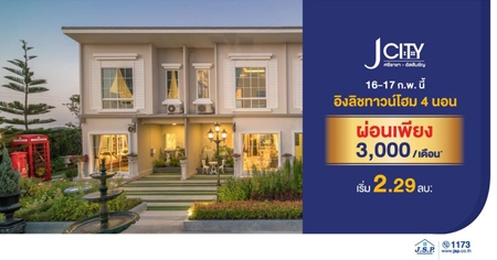 เจ.เอส.พี. พร็อพเพอร์ตี้ จัดโปรโมชั่น ทาวน์โฮมติดอัสสัมชัญ ศรีราชา "เจ ซิตี้ ศรีราชา - อัสสัมชัญ" ทาวน์โฮมสไตล์อังกฤษ 4 ห้องนอน 2 ห้องน้ำ 1 ที่จอดรถ บนทำเลศักยภาพของศรีราชา ฟังก์ชั่นเยอะ อยู่สบาย ตอบโจทย์การพักอาศัยในทุกด้าน ครบครันด้วย Facilities ทั้งคลับเฮ้าส์, สระว่ายน้ำ, ฟิตเนส, สนามเด็กเล่น ฯลฯ เดินทางง่าย ใกล้โรบินสัน ศรีราชา, ติด ร.ร. อัสสัมชัญ ศรีราชา, J Park Shopping Mall และรพ. สมิติเวช ศรีราชา พร้อมโปรโมชั่นพิเศษ !! ผ่อนเพียง 3,000 บาท/เดือน* 16 - 17 กุมภาพันธ์ 2562 นี้ ราคาเริ่ม 2.29 ล้านบาท*