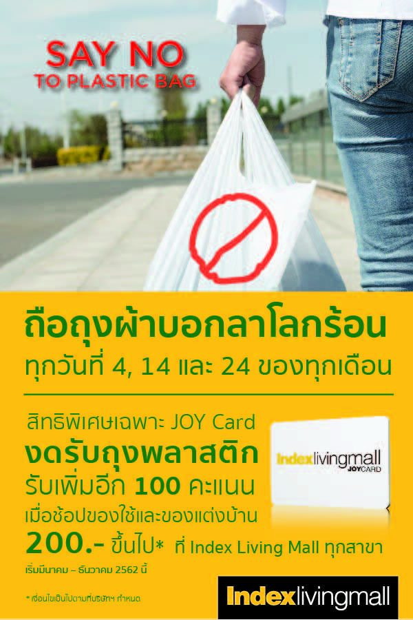 อินเด็กซ์ ลิฟวิ่งมอลล์ (Index Living Mall)ในฐานะผู้นำค้าปลีกเฟอร์นิเจอร์ของตกแต่งบ้าน และของใช้ในบ้าน รวมถึงเครื่องใช้ไฟฟ้าชั้นนำของไทย ประกาศเจตนารมณ์เดินหน้าร่วมเป็นหนึ่งในองค์กรที่อนุรักษ์สิ่งแวดล้อม โดยมุ่งรณรงค์“ประกาศงดใช้ถุงพลาสติก” ลดและเลิกการใช้ถุงพลาสติกอย่างเป็นรูปธรรมผ่านทุกสาขาของอินเด็กซ์ ลิฟวิ่งมอลล์ ทั่วประเทศ ในทุกวันที่ 4 ของเดือน พร้อมเตรียมแผนขยายวันเพิ่มเป็น 3 วันต่อเดือน ได้แก่ ทุกวันที่ 4, 14และ 24 ตั้งแต่มีนาคมศกนี้เป็นต้นไปมั่นใจลูกค้าสมาชิกที่ถือบัตร JOY Card ตอบรับดี!!