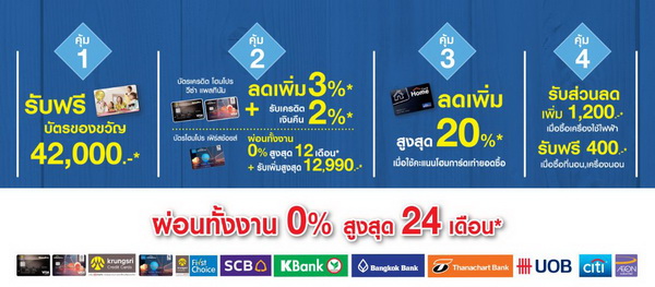 ต่อเนื่องกับคอมโบ คุ้ม 2 ลูกค้าบัตรเครดิต โฮมโปร วีซ่า แพลตินัม รับส่วนลดเพิ่มทันที 3% พร้อมรับเครดิตเงินคืน 2% ช้อปเพลินต่อแบบชิลล์ๆ หรือลูกค้าบัตรเครดิต โฮมโปร เฟิร์สช้อยส์ ผ่อนชำระทั้งงาน 0% นานสูงสุด 12 เดือน พร้อมรับเครดิตเงินคืนเพิ่มสูงสุด 12,990 บาท คุ้ม 3 สมาชิกบัตรโฮมการ์ดรับส่วนลดเพิ่มสูงสุด 20%!! เมื่อใช้คะแนนโฮมการ์ดเท่ายอดซื้อ และปิดท้ายกับ คุ้ม 4 รับส่วนลดเพิ่ม 1,200 บาท เมื่อซื้อสินค้าในแผนกเครื่องใช้ไฟฟ้า พร้อมรับฟรีเครดิตเงิน 400 บาท เมื่อซื้อสินค้าที่นอน-ชุดเครื่องนอน