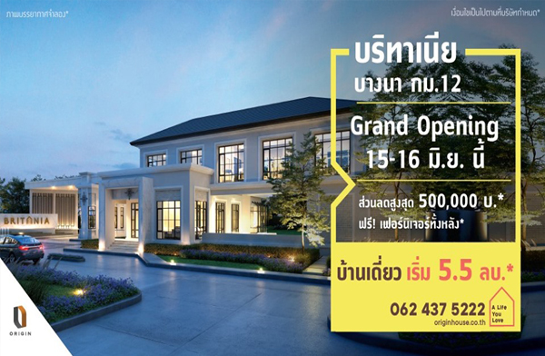 ออริจิ้น เตรียมจัด Grand Opening บ้านเดี่ยวทำเลใกล้สนามบินสุวรรณภูมิ "บริทาเนีย บางนา กม.12" บ้านเดี่ยวติดถนนใหญ่ ใกล้สนามบินสุวรรณภูมิ และทางด่วน ลงตัวทุกการพักอาศัย ออกแบบสไตล์ British Luxury Comfort พร้อมโปรโมชั่นพิเศษ !!! ฟรีเฟอร์นิเจอร์ทั้งหลัง* Grand Opening พร้อมกัน 15 - 16 มิถุนายน 2562 นี้ ราคาเริ่ม 5.5 ล้านบาท*
