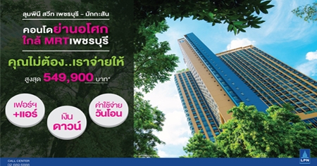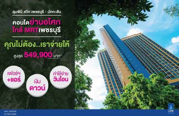 แอล.พี.เอ็น จัดโปรซื้อปุ๊บ ลุมพินี เติมให้ปั๊บ 3 อย่าง คอนโดทำเลอโศก ใกล้รถไฟฟ้า MRTเพชรบุรี ลุมพินี สวีท เพชรบุรี - มักกะสัน คอนโดทำเลอโศก ใกล้รถไฟฟ้า 2 สาย (MRTเพชรบุรี,แอร์พอร์ตลิ้งค์ มักกะสัน) เพียง 5 นาที ถึงอโศก และโครงการมีรถรับส่ง MRTเพชรบุรี ฟรี! สะดวก สบาย เซฟค่าใช้จ่าย และปลอดภัย เงินดาวน์* เฟอร์นิเจอร์+แอร์* ค่าใช้จ่ายวันโอนฯ* ราคาเริ่ม 3.2 ล้านบาท*