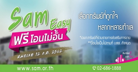 นายนิยต มาศะวิสุทธิ์ กรรมการผู้จัดการ บริษัท บริหารสินทรัพย์สุขุมวิท จำกัด (บสส.) หรือ SAM เปิดเผยว่า SAM ออกโปรโมชั่นใหม่เอาใจลูกค้ากลุ่มนักลงทุน “SAM Easy ฟรีโอนไม่อั้น” โดยออกค่าธรรมเนียมการโอนกรรมสิทธิ์ตามจริงให้แก่ลูกค้าที่ซื้อทรัพย์ NPA ที่ร่วมรายการส่งเสริมการขายในโปรโมชั่นนี้ด้วยวิธีซื้อตรง ตั้งแต่วันนี้ - 12 กรกฎาคม 2562 โดย SAM คัดทรัพย์เด็ดๆ ที่เหมาะกับการลงทุน มูลค่ารวมกว่า 1,500 ล้านบาท เข้าร่วมรายการส่งเสริมการขายในครั้งนี้ พร้อมกันนี้ SAM ยังได้ขยายระยะเวลาโปรโมชั่นเดิมสุดฮอต ออกไปจนถึงวันที่ 30 กันยายน 2562 คือ “SAM Easy ฟรีค่าโอน 1%” โดยออกค่าธรรมเนียมการโอนกรรมสิทธิ์ 1% ให้แก่ลูกค้าที่ซื้อทรัพย์ NPA ทุกประเภทที่มีราคาไม่เกิน 10 ล้านบาท ด้วยวิธีซื้อตรง และ “โปรโมชั่น “SAM Easy 1 2 3 4 5” ยิ่งซื้อมาก ยิ่งได้มาก โดยมอบบัตรกำนัล (Gift Voucher) จากร้านค้าจำหน่ายวัสดุตกแต่งบ้านชั้นนำของไทย อาทิ อิเกีย โฮมโปร เทสโก้โลตัส บิ๊กซี ฯลฯ ให้กับลูกค้าที่ซื้อทรัพย์ NPA ประเภทห้องชุดพักอาศัย ที่มีราคาตั้งแต่ 2.5 แสนบาท ถึง 10 ล้านบาท พร้อมกันในคราวเดียวหลายๆ ห้องด้วยวิธีซื้อตรง ตามมูลค่าที่กำหนดไว้เป็นลำดับขั้นของจำนวนห้องชุดที่ซื้อ มูลค่าสูงสุดถึง 1 แสนบาท