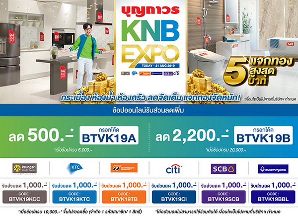 บุญถาวรเซรามิคอัดแคมเปญ “KNB EXPO 2019" ปีที่ 2ตามคำเรียกร้อง พบกับสินค้ากระเบื้อง ห้องน้ำ ห้องครัว รวมถึงสินค้า DIYที่ ลดจัดเต็ม แจกทองจัดหนักสูงสุดถึง 5 บาทและมอบสิทธิพิเศษอื่นๆ เพิ่มเติมอีกมากมาย พร้อมให้บริการติดตั้งสุขภัณฑ์ฟรีที่บุญถาวรทุกสาขาหรือช้อปออนไลน์ได้ส่วนลดเพิ่มสูงสุด 2,200 บาท ที่ www.boonthavorn.comตลอด 24 ชม. จัดส่งถึงที่ทั่วประเทศ ตั้งแต่วันนี้ – 31 สิงหาคม 2562