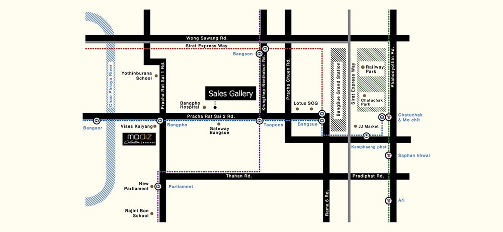 Modiz Collection บางโพ ตั้งอยู่ติดถนนประชาราษฎร์ สาย 1 ใกล้รถไฟฟ้าสายสีน้ำเงิน ส่วนต่อขยายช่วงบางซื่อ-ท่าพระ สถานีบางโพ