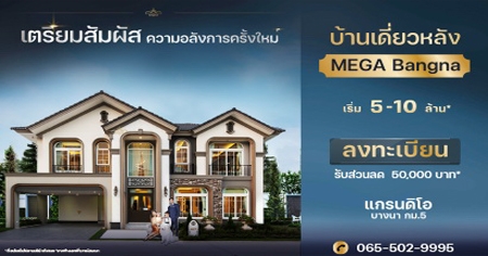 เตรียมสัมผัสความอลังการครั้งใหม่ บ้านเดี่ยว หลัง MEGA บางนา เตรียมพบโครงการใหม่ "แกรนดิโอ บางนา กม.5" บ้านสไตล์ยุโรป 4 ห้องนอน 2 ที่จอดรถ ทำเลศักยภาพ อยู่หลัง MEGA บางนา สะดวก เชื่อมต่อทุกการเดินทาง " ใกล้ทางด่วน + รถไฟฟ้าสายสีเหลือง " ราคาเริ่ม 5 - 10 ล้านบาท*