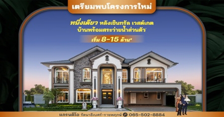 บ้านเดี่ยวหรู โครงการใหม่ หลังเซ็นทรัล เวสต์เกต เตรียมพบโครงการใหม่ "แกรนดิโอ รัตนาธิเบศร์-ราชพฤกษ์" บ้านเดี่ยวหรู 5 ห้องนอน 3 ที่จอดรถ สไตล์ยุโรป พร้อมสระว่ายน้ำส่วนตัว ส่วนกลางครบครัน หนึ่งเดียว หลังเซ็นทรัล เวสต์เกต ติดถนนใหญ่ " เพียง 5 นาที* ถึงรถไฟฟ้าสถานีบางพลู " ราคาเริ่ม 8 - 15 ล้านบาท*
