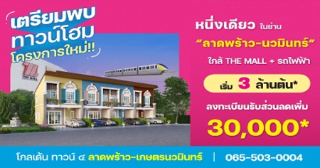 ทาวน์โฮมโครงการใหม่ หนึ่งเดียวในย่าน ลาดพร้าว-นวมินทร์ เตรียมพบโครงการใหม่ "โกลเด้น ทาวน์ ๔ ลาดพร้าว-เกษตรนวมินทร์" ทาวน์โฮม ฟังก์ชันการใช้งานครบครัน พร้อมสโมสรส่วนกลาง รองรับทุกกิจกรรมของทุกคนในครอบครัว ทำเลศัดยภาพ หนึ่งเดียวในย่าน ลาดพร้าว-นวมนทร์ " ใกล้เดอะมอลล์ บางกะปิ + รถไฟฟ้าสายสีเหลือง " ราคาเริ่ม 3 ล้านต้น*