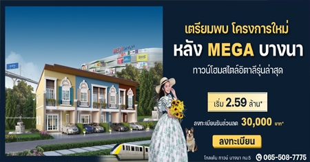 เตรียมพบ ทาวน์โฮมโครงการใหม่ หลัง MEGA บางนา เตรียมพบโครงการใหม่ "โกลเด้น ทาวน์ บางนา กม.5" ทาวน์โฮม 4 ห้องนอน 2 ที่จอดรถ สไตล์อิตาลีรุ่นล่าสุด บนทำเลศักยภาพ อยู่หลัง MEGA บางนา สะดวกสบาย เชื่อมต่อทุกการเดินทาง " ใกล้ทางด่วน และ รถไฟฟ้าสายสีเหลือง " ราคาเริ่ม 2.59 ล้านบาท*