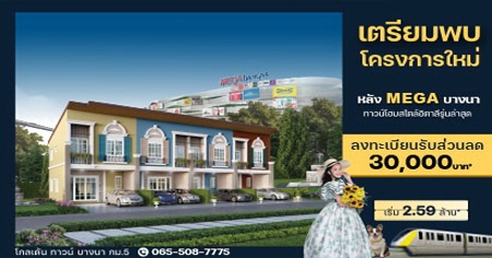 เตรียมพบ โครงการใหม่ ทาวน์โฮม หลัง MEGA บางนา เตรียมพบโครงการใหม่ "โกลเด้น ทาวน์ บางนา กม.5" ทาวน์โฮม 4 ห้องนอน สไตล์อิตาลีรุ่นล่าสุด ทำเลศักยภาพ อยู่หลัง MAGA บางนา สะดวก เชื่อมต่อทุกการเดินทาง " ใกล้ทางด่วน และ รถไฟฟ้าสายสีเหลือง " ราคาเริ่ม 2.59 ล้านบาท*