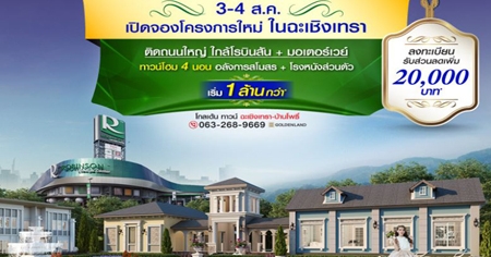 โกลเด้นแลนด์ เตรียมเปิดจอง ทาวน์โฮมโครงการใหม่ ใจกลางเมืองฉะเชิงเทรา โกลเด้นแลนด์ เตรียมเปิดจองโครงการใหม่ "โกลเด้น ทาวน์ ฉะเชิงเทรา" ทาวน์โฮมสุดหรู 2 ชั้น 4 ห้องนอน ทำเลติดถนนใหญ่ เตรียมพบโครงการใหม่ ใจกลางทำเลเมืองฉะเชิงเทรา ใกล้โรบินสัน + มอเตอร์เวย์ ทาวน์โฮมสไตล์อังกฤษ พร้อมโรงหนังส่วนตัว + อลังการสโมสร และสวนสวยรอบโครงการ เปิดจองพร้อมกัน 3 - 4 สิงหาคม 2562 นี้ ราคาเริ่ม 1.59 ล้านบาท*