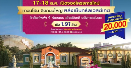 เตรียมพบทาวน์โฮมโครงการใหม่ ทำเลหลังเซ็นทรัล เวสต์เกต โกลเด้นแลนด์ เตรียมเปิดจองโครงการใหม่ "โกลเด้น ทาวน์ รัตนาธิเบศร์ - เวสต์เกต" ทาวน์โฮมสุดหรู 4 ห้องนอน พร้อมอลังการสโมสรสไตล์อิตาลี พบโครงการใหม่ ทำเลหลังเซ็นทรัล เวสต์เกต ติดถนนใหญ่ ใกล้รถไฟฟ้า เปิดจองพร้อมกัน 17 - 18 สิงหาคม 2562 นี้ ราคาเริ่ม 1.97 ล้านบาท*