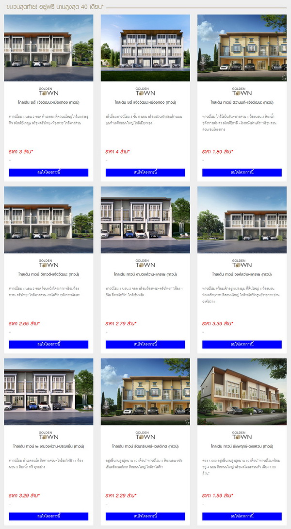 โกลเด้นแลนด์ จัดโปรเกินคุ้ม อยู่ฟรีนานสูงสุด 40 เดือน* "โกลเด้นแลนด์" จัดโปรหนัก จองบ้าน ทาวน์โฮม พร้อมอยู่ได้แล้ววันนี้ " โปรคุ้มเกินคุ้ม อยู่ฟรี! นานสูงสุด 40 เดือน* " บนทุกทำเลคุณภาพ จากโกลเด้นแลนด์ ตั้งแต่วันนี้ ถึง 30 กันยายน 2563 เท่านั้น* ราคาเริ่ม 1.59 - 10 ล้านบาท*