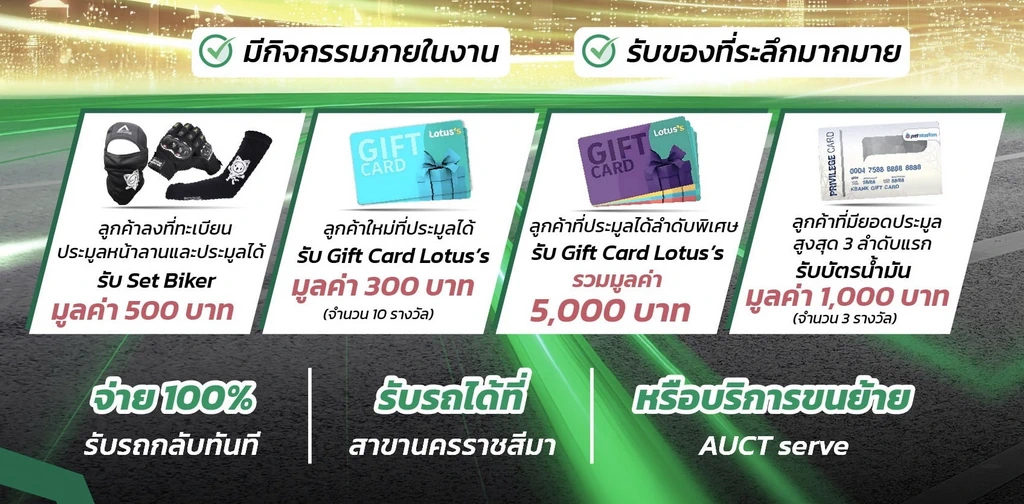 นอกจากนี้แล้วหากเป็นลูกค้าใหม่ที่ประมูลซื้อได้ รับฟรี Gift Card Lotus มูลค่า 300 บาท ที่สำคัญลูกค้าที่ประมูลซื้อรถได้ในลำดับพิเศษ รับฟรี Gift Card Lotus มูลค่า 5,000 บาท และลูกค้าที่มียอดประมูลสูงสุด 3 ลำดับแรก รับฟรีบัตรเติมน้ำมันมูลค่า 1,000 บาท สำหรับผู้ที่ต้องการร่วมงานดังกล่าว