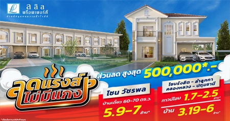 ลดแรงส์ ไม่มีแกง รับส่วนลดสูงสุด 500,000 บาท* "ลลิล พร็อพเพอร์ตี้" พบกับ ทาวน์โฮม บ้านเดี่ยว บ้านแฝด สมบูรณ์แบบ กับฟังก์ชั่นบ้านที่ออกแบบสำหรับคนรุ่นใหม่ " ส่วนลดสูงสุด 500,000 บาท* " บนทำศักยภาพ โซนรังสิต - ลำลูกกา - คลองหลวง - ปทุมธานี ทาวน์โฮม เริ่ม 1.7 - 2.5 ล้านบาท* บ้านเริ่ม 3.19 - 6 ล้านบาท* และบ้านเดี่ยวหลังใหญ่ ขนาด 60 - 70 ตร.วา โซนวัชรพล เริ่ม 5.9 - 7 ล้านบาท*