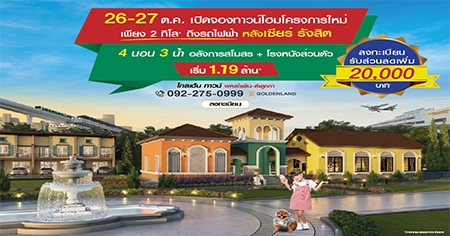 โกลเด้นแลนด์ เตรียมเปิดจองโครงการใหม่ "โกลเด้น ทาวน์ พหลโยธิน-ลำลูกกา" ทาวน์โฮม 4 ห้องนอน 3 ห้องน้ำ พร้อมอลังการสโมสร + โรงหนังส่วนตัว ทำเลหลังเซียร์ รังสิต เพียง 2 กิโลเมตร* ถึงรถไฟฟ้า เปิดจอง 26 - 27 ตุลาคม 2562 นี้ ราคาเริ่ม 1.79 ล้านบาท*
