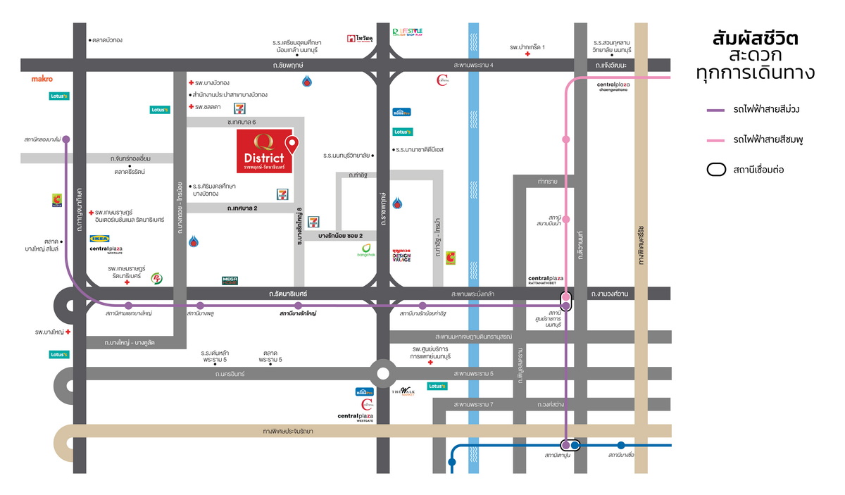โครงการ “คิว ดิสทริค ราชพฤกษ์-รัตนาธิเบศร์” ตั้งอยู่บนทำเลศักยภาพถนนบางกรวย-ไทรน้อย ในซอยเทศบาล 6 เดินทางเชื่อมต่อได้หลากหลายเส้นทาง ถนนรัตนาธิเบศร์ ถนนงามวงศ์วาน ถนนกาญจนาภิเษก ถนนชัยพฤกษ์ ถนนแจ้งวัฒนะ อีกทั้งใกล้สถานีรถไฟฟ้าสายสีม่วง สถานีบางรักใหญ่ ใกล้แหล่งไลฟ์สไตล์ ทั้งห้างสรรพสินค้า มหาวิทยาลัย โรงเรียน โรงพยาบาล และแหล่งจับจ่ายใช้สอย อาทิ