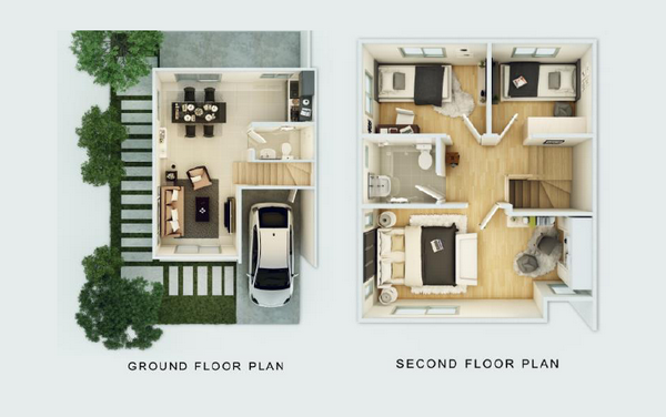 - แปลนชั้น 1 : เริ่มจากหน้าบ้านสามารถจอดรถได้ 1 คัน หน้าบ้านเหลือพื้นที่ทำเป็นสวนขนาดเล็กได้ และหากเป็นบ้านแปลงมุมก็จะมีพื้นที่สวนข้างบ้านเพิ่มเติมเข้ามาแบบในแปลน เข้าไปในตัวบ้านส่วนแรก เจอกับห้องนั่งเล่นเปิดโล่งเชื่อมต่อเข้าไปด้านยังโซนรับประทานอาหาร อีกฝั่งใช้งานเป็นห้องครัวซึ่งอาจต่อเติมฉากทำเป็นห้องนอนก็ได้ ซึ่งทางโครงการทำบ้านตัวอย่างให้ดูเป็นห้องนอน มีห้องน้ำชั้นล่าง