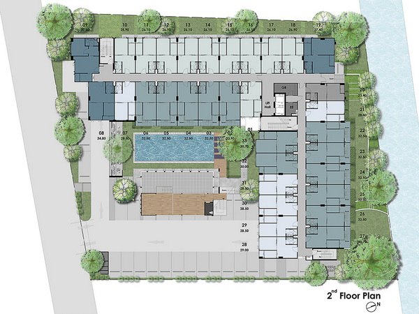 จากแปลนอาคารชั้น 2 จะมีห้องพักอยู่ทั้งหมด 33 ยูนิต มีการวางแปลนโถงทางเดินแบบ Double Corridor คือมีห้องเรียงอยู่ทั้ง 2 ฟากของโถงทางเดิน ภายในอาคารมีลิฟท์โดยสารอยู่ 2 ตัวบริเวณ Core กลางของอาคาร ซึ่งคิดเป็นอัตราส่วนจำนวนยูนิตพักอาศัยต่อจำนวนลิฟท์เป็น 116 : 1 แต่ด้วยอาคารสูงเพียง 8 ชั้นจึงถือว่าเป็นอัตราส่วนที่ยังพอรับได้ การรอลิฟท์จะไม่นานมากนัก ห้องของชั้น 2 จะเป็นห้องแบบ 1 Bedroom ทั้งหมด ส่วนตามมุมของอาคารจะเป็นห้องแบบ 1 Bedroom ขนาดใหญ่ และห้องแบบ 1 Bedroom Plus ความพิเศษของห้องในชั้น 2 คือ จะมีห้องแบบ Terrace ซึ่งห้องนี้จะมีระเบียงห้องเป็น Pool Access และ Garden Access สามารถเดินลงไปยังสระว่ายน้ำ และสวนได้เลย