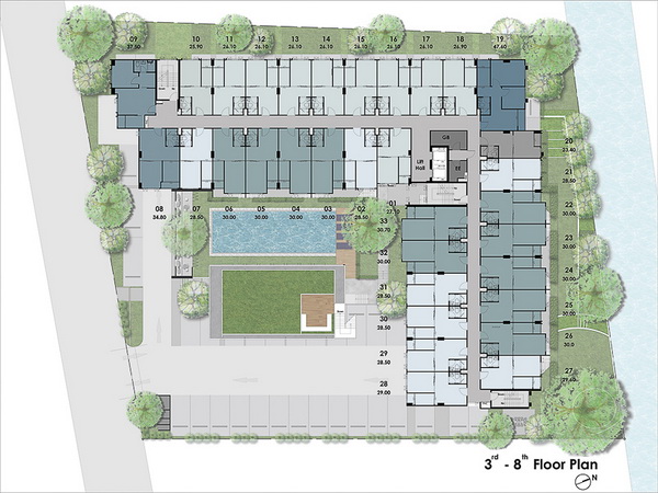 ในส่วนของแปลนอาคารชั้น 3-8 ก็จะมีลักษณะเหมือนกับการวางแปลนอาคารชั้น 2 มีห้องพักทั้งหมด 33 ยูนิต แต่จะมีแบบห้อง 2 Bedroom ขึ้นมาอยู่ที่มุมขวาบนของอาคาร ซึ่งจะมีเพียงชั้นละห้องเท่านั้น