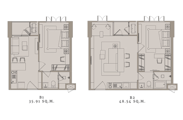 1 Bedroom-B1 : 35.91 ตร.ม. / Exclusive 1 Bedroom-B2 : 48.54 ตร.ม.