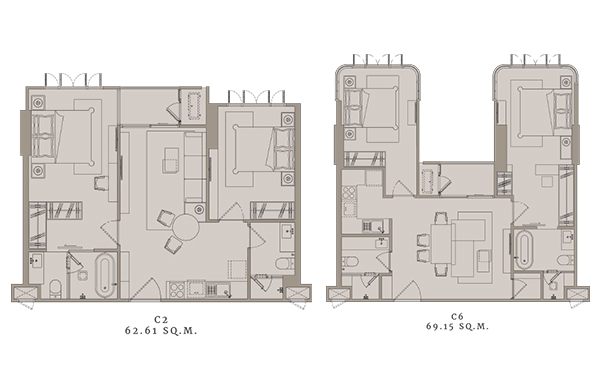 Exclusive 2 Bedrooms-C2 : 62.61 ตร.ม. / Sky Courtyard-C6 : 69.15 ตร.ม.