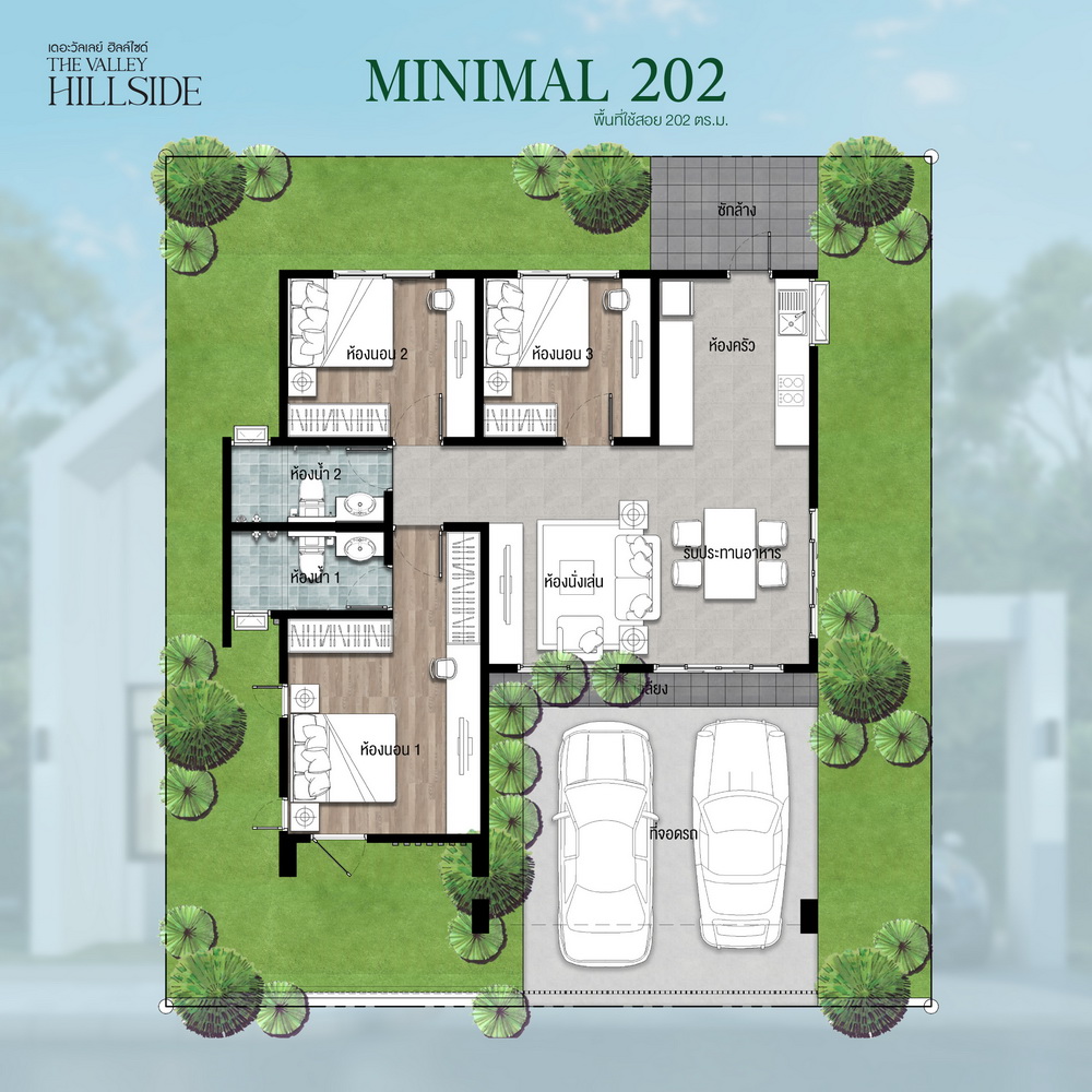 แบบบ้าน Minimal 202 | บ้านเดี่ยว 1 ชั้น พื้นที่ใช้สอย 202 ตร.ม. (พื้นที่ใช้สอยทั้งหมดภายในรั้วบ้าน)