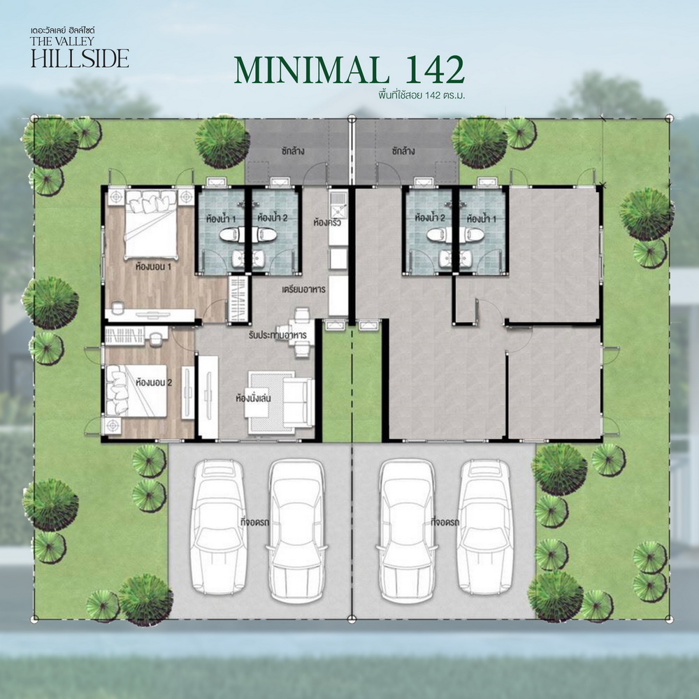 แบบบ้าน Minimal 142| บ้านแฝด 1 ชั้น พื้นที่ใช้สอย 142 ตร.ม. (พื้นที่ใช้สอยทั้งหมดภายในรั้วบ้าน)