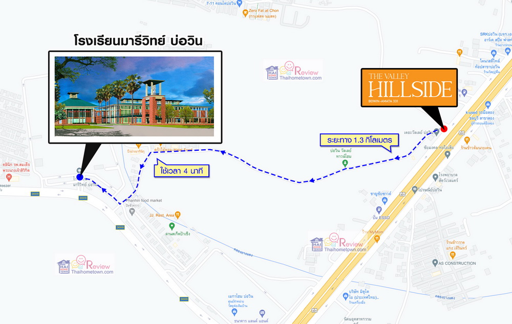 โรงเรียนโรงเรียนมารีวิทย์ บ่อวิน จากโครงการยังโดยยังไม่ต้องออกถนนใหญ่ จะมีทางลัดอยู่บริเวณด้านหน้าถนนใหญ่ให้เลี้ยวขวาเข้าซอยไป ให้ขับตามทางไปเรื่อยๆ โดยจะต้องผ่านโรงแรมพานหินรีเจ้นท์ และตัวโรงเรียนจะอยู่ทางขวามือครับ ระยะทาง 1.3 กม. ใช้เวลา 4 นาที