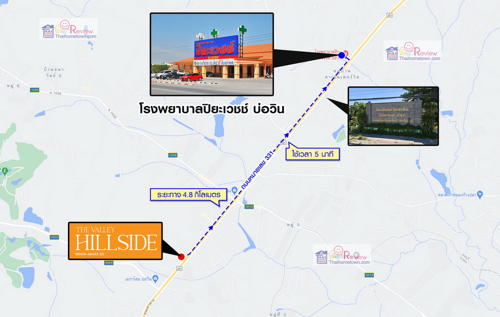 โรงพยาบาลปิยะเวชช์ บ่อวิน ออกจากโครงการเลี้ยวซ้าย ขับตรงยาว บนถนนหมายเลข 331 โดยจะต้องผ่านโรบินสัน ไลฟ์สไตล์ บ่อวิน จากนั้นให้ขับตรงต่อไปบนถนน 331 สักระยะก็จะพบกับโรงพยาบาลปิยะเวชช์ บ่อวิน อยู่ทางซ้ายมือครับ ระยะทาง 4.8 กม. ใช้เวลา 5 นาที