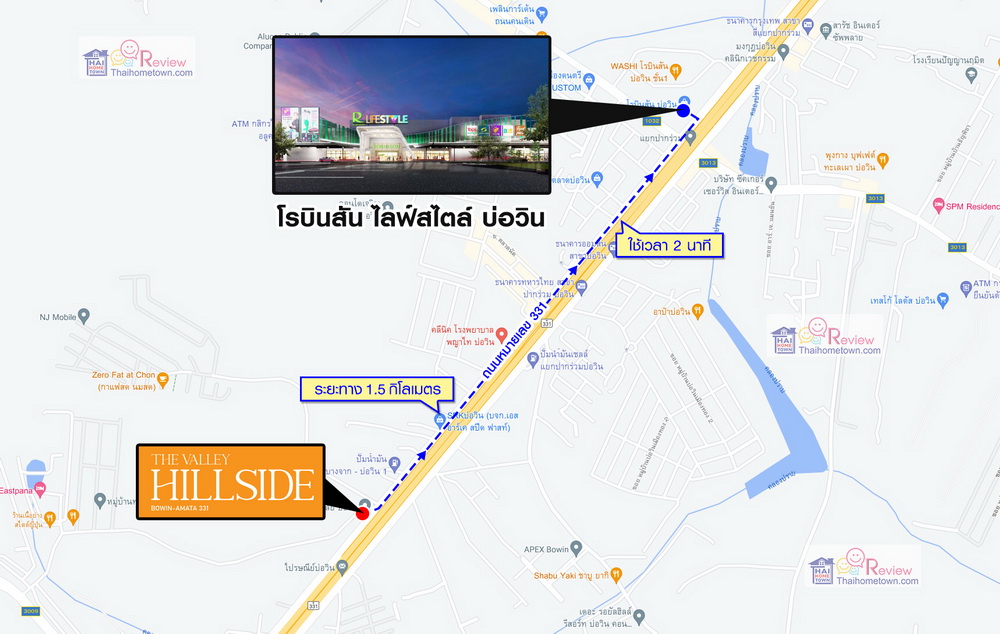 โรบินสัน ไลฟ์สไตล์ บ่อวิน ออกจากโครงการเลี้ยวซ้าย ใช้เส้นทางหลวง 331 ขับตรงไปเพียง 1.5 กม. ก็จะพบกับโรบินสัน บ่อวินอยู่ทางซ้ายมือ ซึ่งเป็นห้างสรรพสินค้าที่ใกล้กับโครงการมากที่สุด ใช้เวลาเพียง 2 นาที