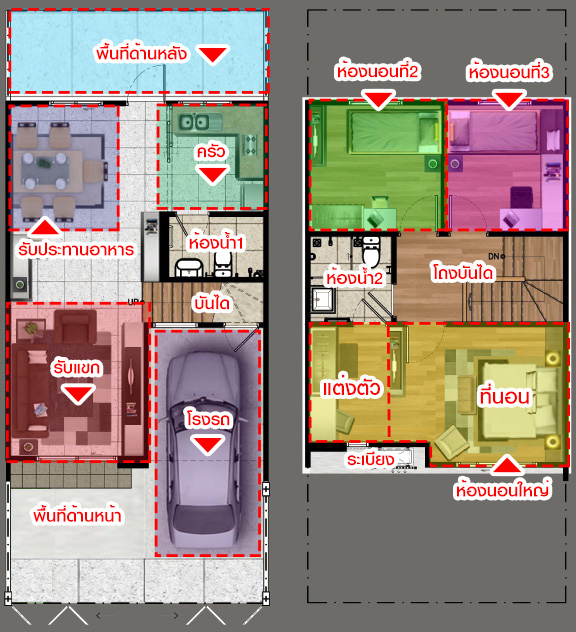 พื้นที่ใช้สอย 95 ตารางเมตร หน้ากว้าง 5.7 เมตร 3 ห้องนอน 2 ห้องน้ำ 1 ที่จอดรถ