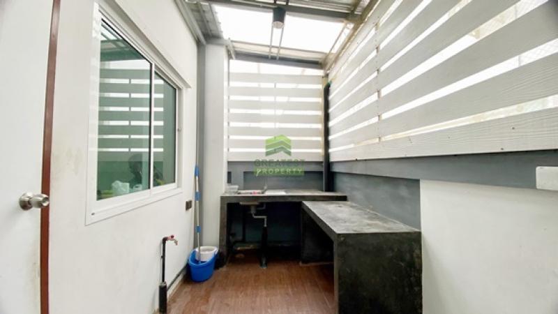 ตกแต่ง : ทาวน์โฮม 2 ชั้น พื้นที่ใช้สอย 104 ตร.ม ชั้นล่างพื้นกระเบื้องแกรนิตโต้ขนาด 60x60 cm. บันไดทำจากไม้เนื้อแข็งและคอนกรีตหล่อราวบันไดสแตนเลสเพิ่มความหรูหรา พื้นชั้นบนปูกระเบื้องลายไม้ ให้ความรู้สึกเหมือนปูพื้นลามิเนต ห้องนอนกว้าง เหมาะแก่การพักผ่อน บริเวณหลังบ้านต่อเติมหลังคาพร้อมปูกระเบื้องเต็มพื้นที่ เคาน์เตอร์ครัวพร้อมอ่างซิงค์ล้างจานอย่างดี เป็นทาวน์โฮมที่จัดสรรพื้นที่ใช้สอยด้วยฟังก์ชันต่างๆได้อย่างลงตัว ฝ้าเล่นระดับสูง 2.8 เมตร ให้ความรู้สึกโปร่ง โล่ง สบายตา