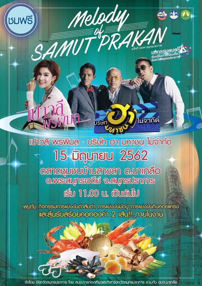 สำนักงานท่องเที่ยวและกีฬาจังหวัดสมุทรปราการ ร่วมกับ องค์การบริหารส่วนตำบลนาเกลือ จัดงาน Melody of Samutprakan วันที่ 15 มิถุนายน 2562 ตั้งแต่เวลา 11.00 น. เป็นต้นไป ณ ตลาดชุมชนบ้านสาขลา ตำบลนาเกลือ อำเภอพระสมุทรเจดีย์ จังหวัดสมุทรปราการ ภายในงานมีออกร้านอาหารถิ่นและสินค้า OTOP ของดีของตำบลนาเกลือ